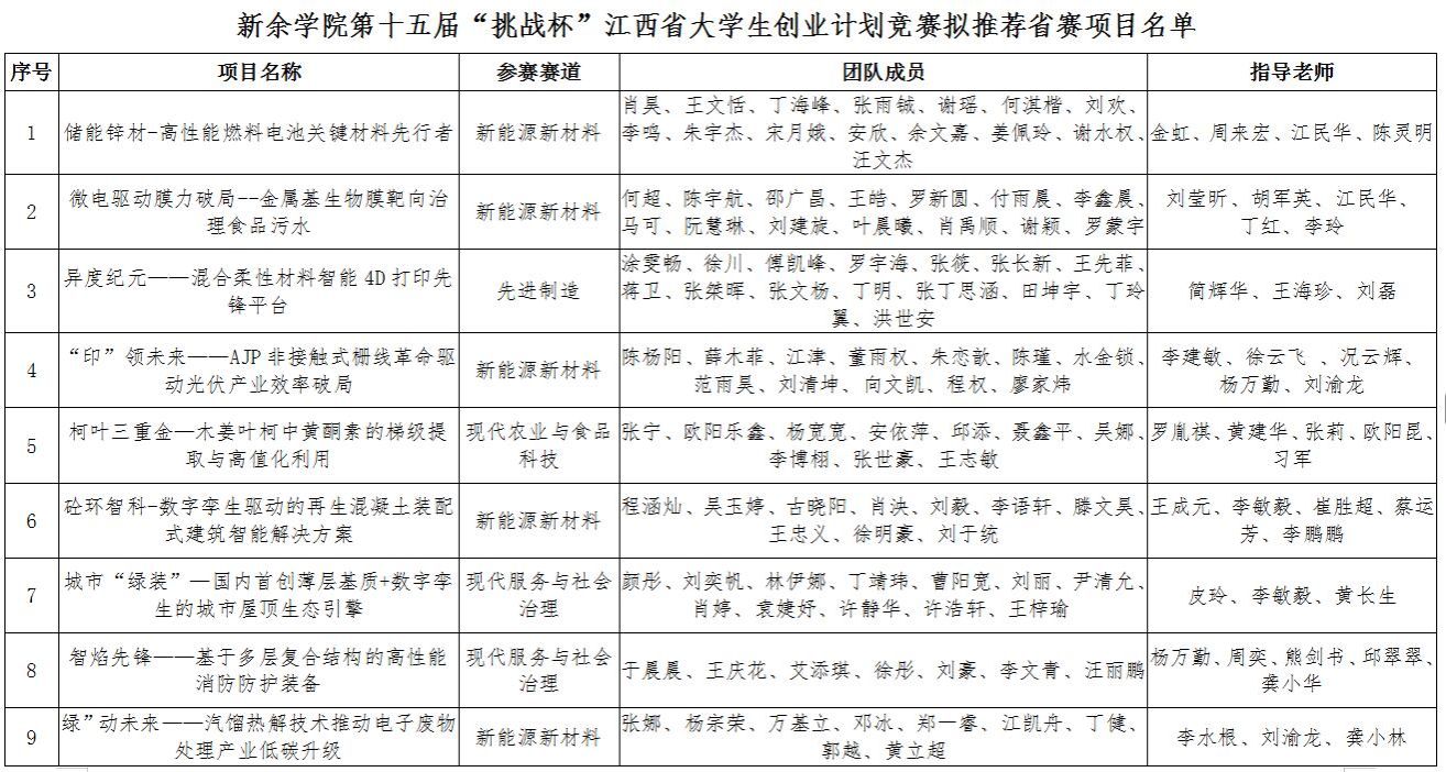 根据《关于举办第十五届“挑战杯”江西省大学生创业计划竞赛的通知》要求,结合工作实际,经校级初赛、复赛、决赛环节,现将拟推荐参加省赛项目公示如下。