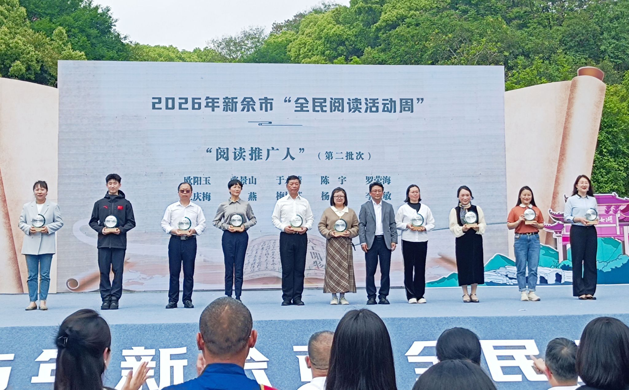 4月18日,由中共新余市委、新余市人民政府主办,市委宣传部、市直机关工委、市文广旅局、市教体局承办的2026年全市“全民阅读活动周”启动仪式在抱石公园举行,校党委委员、宣传部部长钟钺,健美操世界冠军张景山老师以及人文学院、对外合作交流中心师生代表70余人参加。