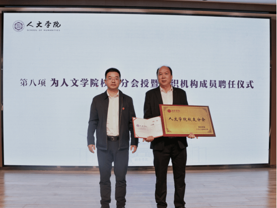 黄益宾为人文学院校友分会授牌,为分会会长颁发聘书。钟钺、黄红平、田建鑫、刘君君为校友分会第一届理事会组织机构成员颁发聘书。