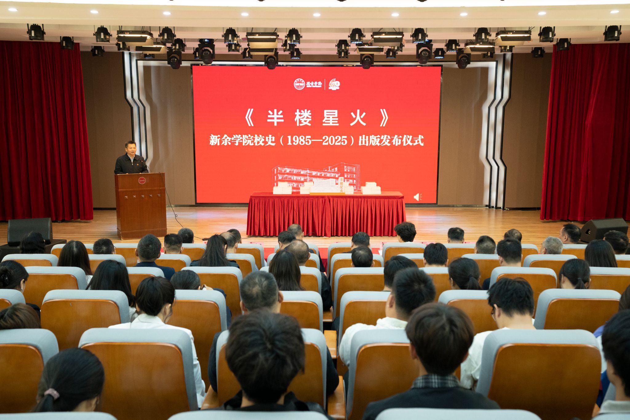 校史编纂与发布,夯实文化传承根基。校庆期间,《半楼星火——新余学院校史(1985—2025)》隆重首发。这部28万字的校史典籍,系统梳理了学校四秩发展历程,既是一部办学记忆的“全景档案”,更是一幅新院精神赓续的“红色家谱”。校党委书记伍复康在首发仪式上强调,校史是“留存办学记忆、传承精神基因、赋能校情教育、展示办学形象”的重要载体,每一页校史都记录着师生们的奋斗足迹,每一段文字都承载着学校的精神基因。老领导、师生及校友代表共同为校史揭幕并赠书,使“求新、求实、求善”的校训精神在典籍中永续传承。