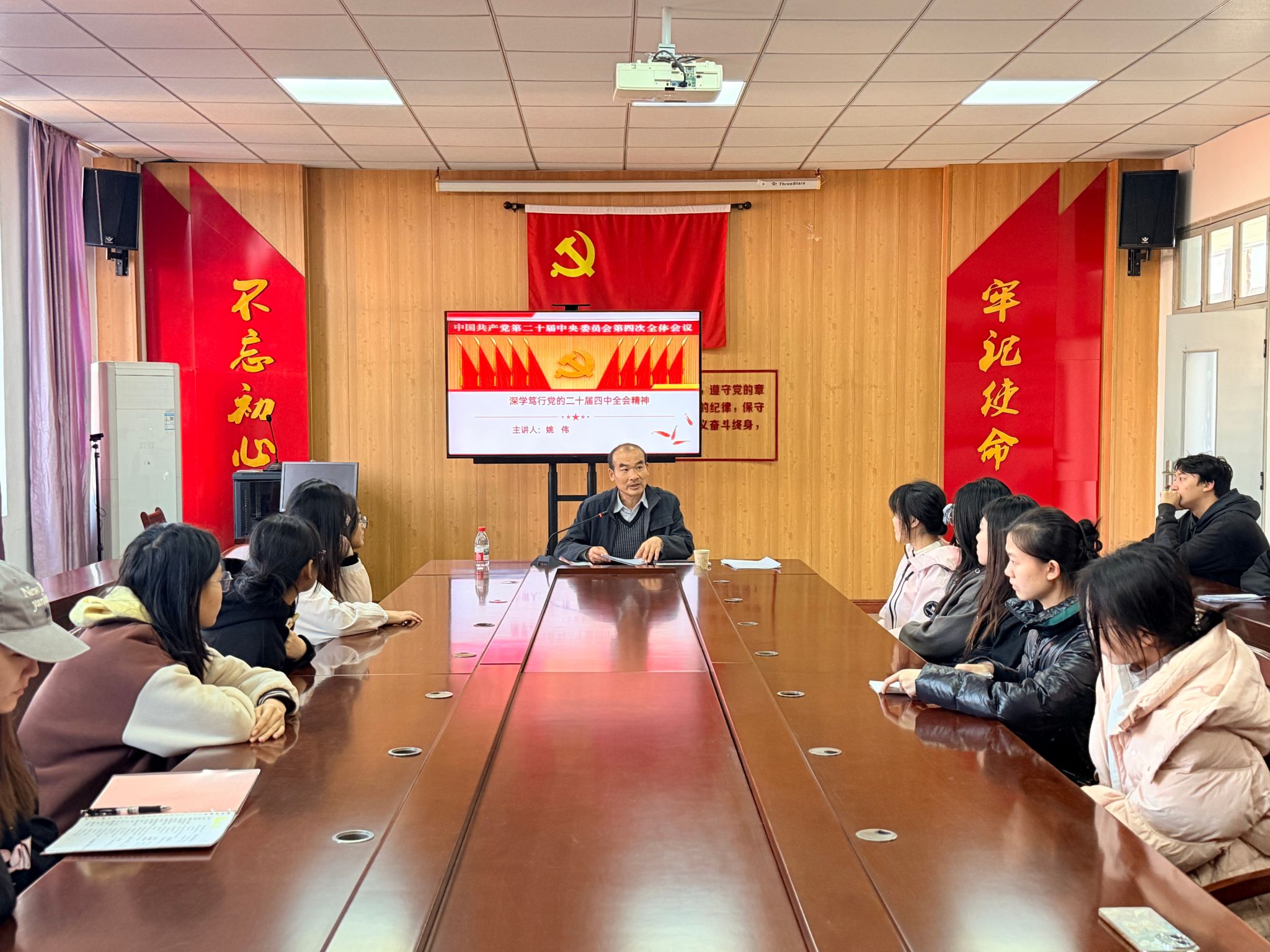 为深入学习贯彻党的二十届四中全会精神,引导青年学生骨干深入领会国家发展蓝图,11月21日下午,校党委委员、统战部部长姚伟在经济管理学院文A308党员活动室,为学院学生党员及入党积极分子代表作专题宣讲。