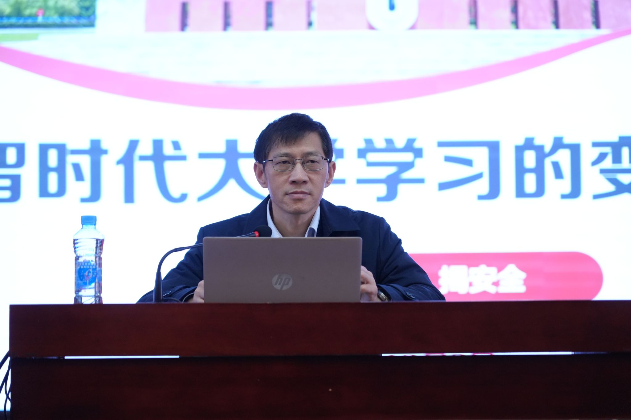 报告会上,揭安全题以“数智时代大学学习的变与不变”为题,从“教育强国,青年何为”的时代命题出发,深入剖析人工智能技术快速发展给社会生活带来的深刻变革,以及对教育形态、教学模式产生的深远影响。结合自身教学科研一线的丰富经历,揭安全围绕数智时代大学生如何高效学习给出了方法路径。他强调,要坚持理论联系实际、在“做中学、学中做”中深化只是理解;要着力提升自主学习与创新实践能力,积极践行“以赛促学、以赛促练”的成长模式;更要勇于走出课堂,在解决实际问题中增长才干、锤炼本领。整场报告既有前沿视野,又有实践指导意义,为在场师生带来深刻启发。