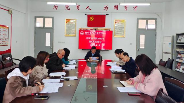 4月18日,外国语学院在党员活动室召开2022年校园平安建设专题党委会,会议由学院党委书记、院长刘华东主持,全体党委班子成员和行政坐班人员参加会议。