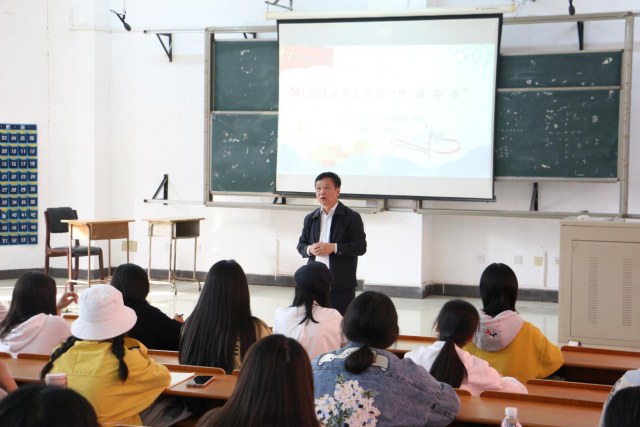 10月28日下午,校党委委员、副校长李敏在外国语学院多媒体教室为2020级新生上了一堂以“读懂疫情大考的中国答案”为主题的思政课。