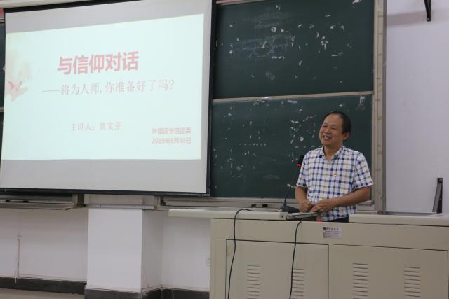 为深入学习贯彻习近平新时代中国特色社会主义思想,引领广大青年传承红色基因,引导青年学生不忘初心、牢记使命,坚定不移听党话、跟党走,9月30日晚7点,外国语学院在文c多媒体教室组织开展了“与信仰对话——将为人师,你准备好了吗?”主题讲座,此次讲座特邀请新余市第三中学党总支副书记黄文芽。