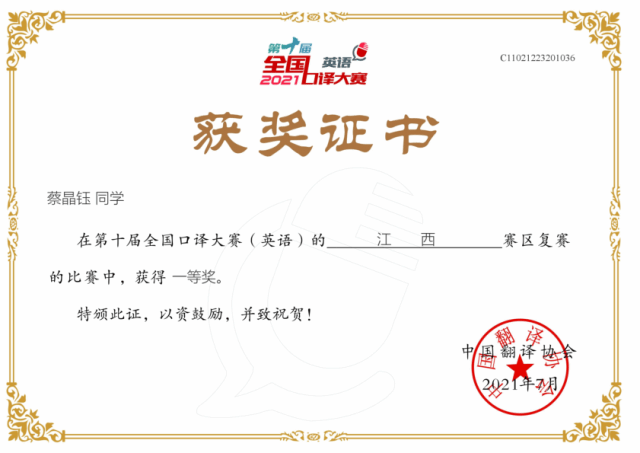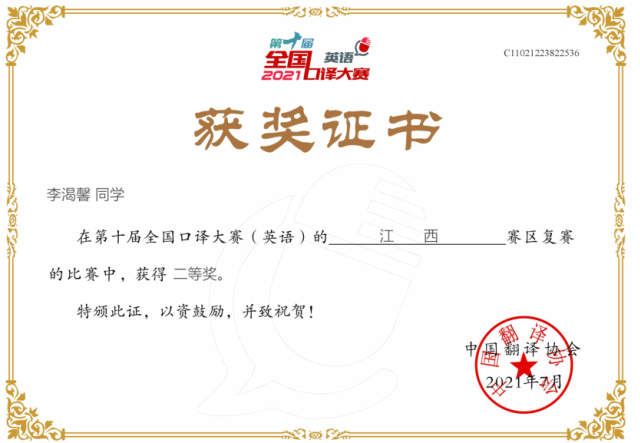 6月12日-13日,由中国翻译协会主办的第十届全国口译大赛(英语)江西赛区复赛顺利举行。本次大赛吸引了来自南昌大学、江西师范大学等全省22所高校的200余名本科生及研究生参加比赛。经过紧张激烈的比赛,我院选送的10名参赛选手中,18英语蔡晶钰同学获得一等奖,19英语李渴馨同学获得了二等奖,另有4名同学获得三等奖,3名同学获得优秀奖。根据大赛规则,蔡晶钰和李渴馨两位同学成功晋级大区赛。