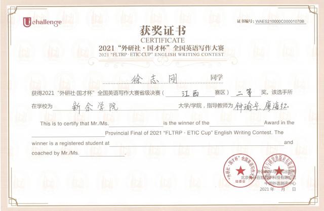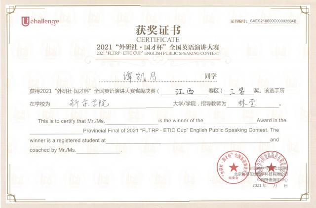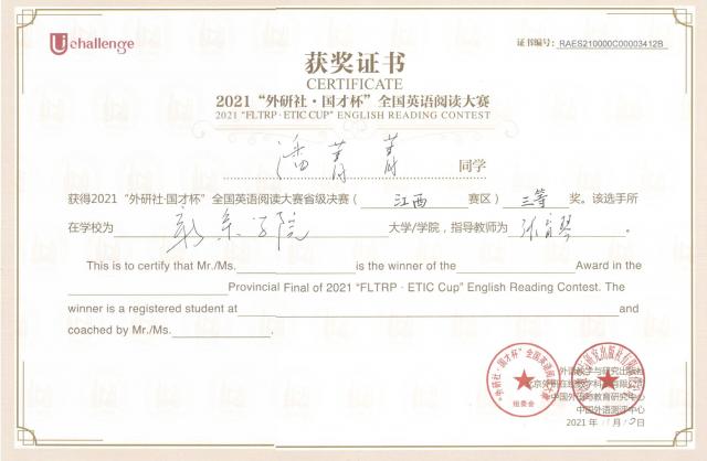 11月6-7日,由江西省教育厅主办的2021年“外研社•国才杯”全国英语大赛江西赛区复赛在线上隆重举行。我校学子克服线上比赛的重重困难,取得了优异成绩,获得二等奖1项,三等奖2项。其中外国语学院2020级英语1班谭凯月荣获英语演讲大赛专业组三等奖,经济管理学院2019级市场营销2班潘菁菁荣获英语阅读大赛非专业组三等奖, 经济管理学院2019级电子商务1班徐志刚荣获写作大赛非专业组二等奖。
