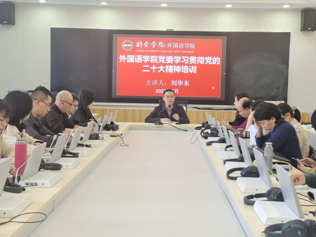 (图/黄仁静 文/黄仁静)3月14日,外国语学院党委书记、院长刘华东在文B云网络智能翻译实训室为学院全体教师讲授党的二十大精神专题培训课。