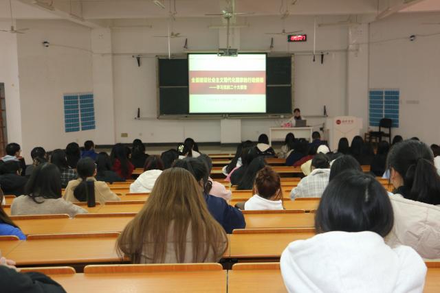 (图/雷伟 文/雷伟)3月21日下午,外国语学院邀请新余市委党校教研二室副主任、讲师王佳,面向学院师生党员深入开展学习贯彻党的二十大精神宣讲。外国语学院学生党支部支委成员、全体辅导员、学生党员、入党积极分子、学生干部及部分学生代表共计200余名师生参加。宣讲会由学院党委副书记谢懿主持。