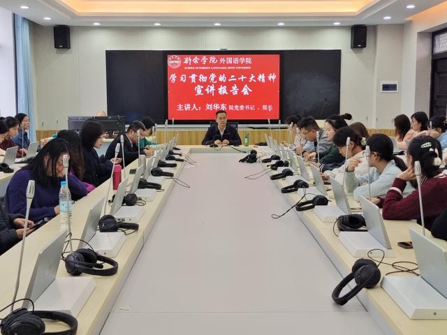 (图文/黄仁静)11月22日下午,外国语学院党委书记、院长刘华东在文B云网络智能翻译实训室宣讲党的二十大精神,学院师生党员、学生入党积极分子代表共计60余人到场聆听。