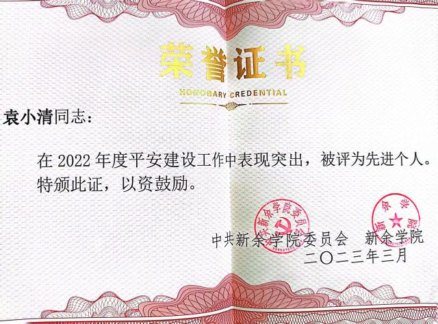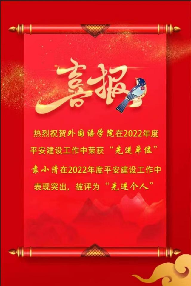 喜报:热烈祝贺外国语学院在2022年度平安建设工作中荣获“先进单位” 袁小清被评为“先进个人”