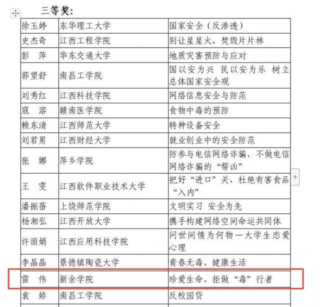 (图/文 黄仁静)近日,2023年江西省大中小学公共安全教育骨干教师教学能力展示活动圆满落幕。由外国语学院选派的袁小清和雷伟两位老师代表新余学院参加了此次比赛,并从全省参赛选手中脱颖而出,袁小清老师荣获“教师组本科阶段”二等奖,雷伟老师荣获“教师组本科阶段”三等奖。