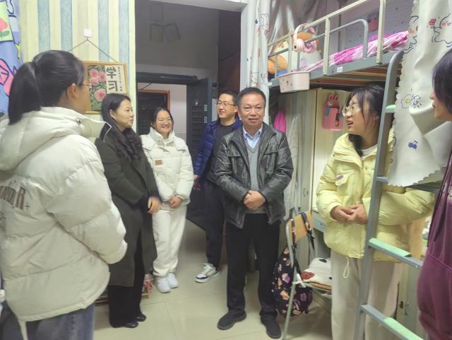 在学生公寓楼,李敏副校长来到他所联系的6栋310宿舍,看望学生并亲切交谈,仔细询问同学们的学习、生活情况及思想状况。他表示,大家目标明确、生活学习状态积极,这就是大学生活的良好开端。希望大家在保持学习劲头的同时,不要忘记锻炼身体,要以良好的身心状态度过四年美好的大学时光。