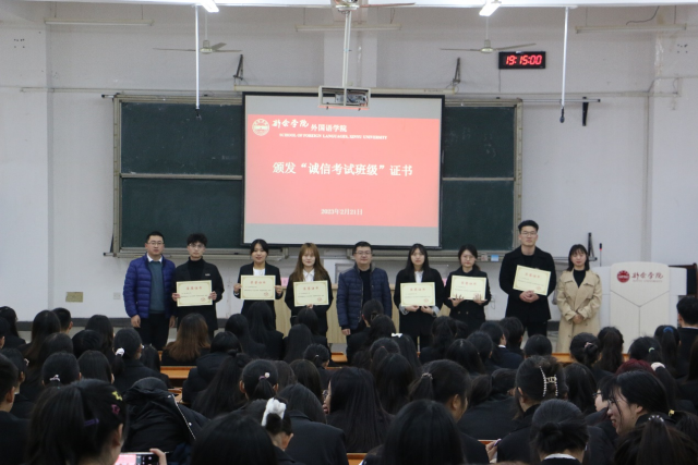 随后,由各老师为先进班集体、三好学生、优秀学生干部、“诚信考试班级”颁发荣誉证书。