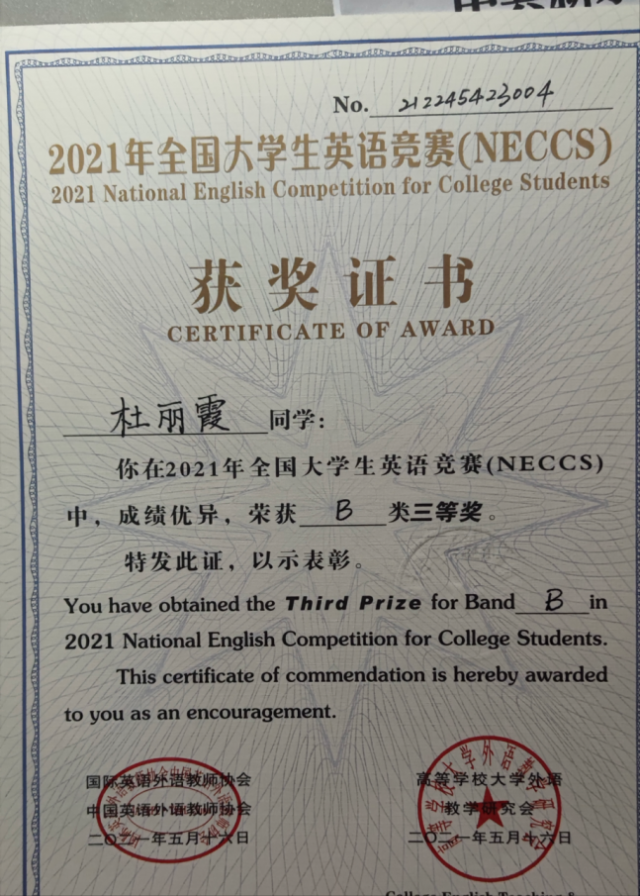 李晴云2021年新余学院英语演讲大赛校级二等奖;廖悦羽,钟美琪同学参加的暑期三下乡获得省级表彰;钟美琪获得优秀学生干部表彰;郑锦涛在争当六有青年演讲比赛中获得院级三等奖;杜丽霞江西省第十二届翻译大赛省级三等奖;尹德明“词达人杯”全国大学生英语词汇能力大赛全国一等奖;陈桂妹,丁楠获得学生手册书法大赛二等奖;周佳美,丁茂凝,谢婷,王艳等获得通信百科知识竞赛团体三等奖;王艳、杜丽霞、罗清获全国大学生计算机设计大赛省级三等奖。