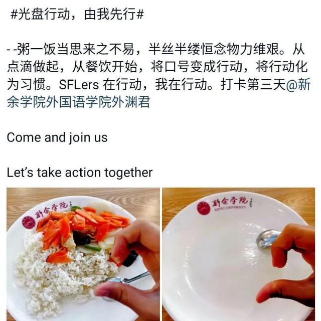 为了深入贯彻落实习近平总书记重要指示精神,坚决抵制餐饮浪费行为,培养勤俭节约的习惯,在全社会营造浪费可耻、节约为荣的氛围,继承和发扬中华民族勤俭节约的优秀品质,外国语学院“萌芽志愿服务”队于2020年11月5日至11月11日在全院推广“光盘行动”系列活动。