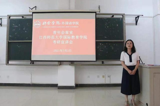 为更好地开展党史学习教育,切实落实“我为师生办实事”工作,外国语学院于2021年7月2日邀请江西师范大学国际教育学院副院长黄淑娟、研究生院秘书孙旭红二人来我校开展考研宣讲会。外国语学院党委副书记胡小刚主持宣讲会。