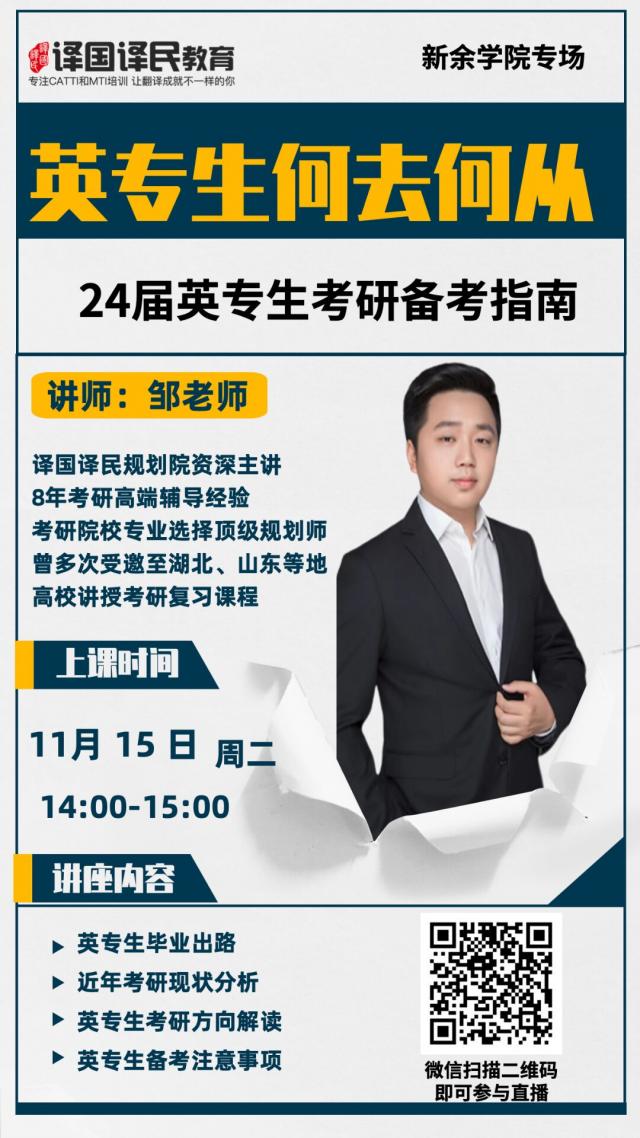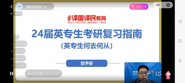(图/袁小清 文/袁小清)踏浪前行正风劲,不负韶华争朝夕。面对当今严峻的社会形势和繁重的就业压力,在就业和深造的十字路口上,越来越多的同学选择走上考研的道路。为帮助决心考研的同学看清形势,端正心态,树立信心,更好地规划自己的考研之路,11月15日下午外国语学院特邀请译国译民教育集团的邹予安老师在线上为外国语学院学生讲解“英语专业学生该何去何从”。