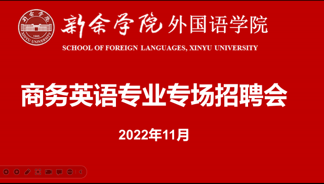 (图/袁小清 文/袁小清)“昭昭若日月之明,离离如星辰之行”为帮助我校学生了解就业形势,构建学校与企业单位相衔接的交流平台,我院于11月10日周五晚上7时召开“外国语学院商务英语专业专场招聘会”。此次招聘会我院邀请了深圳市莱卡斯科技有限公司法人代表赵子番先生做线上主讲。