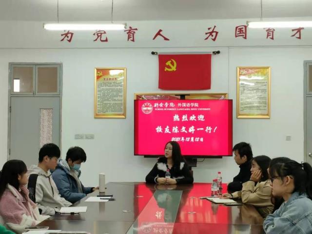 为充分发挥优秀校友的榜样力量,增强同学们的职业生涯规划能力,12月12日上午,外国语学院邀请2015届优秀校友代表陈文婷返校作就业经验交流,院学生管理与就业科副科长袁小清主持会议。本次交流会采用“线上+线下”模式同步进行,2019级部分学生代表参加现场交流,学院其他在校生均通过直播平台线上观看。