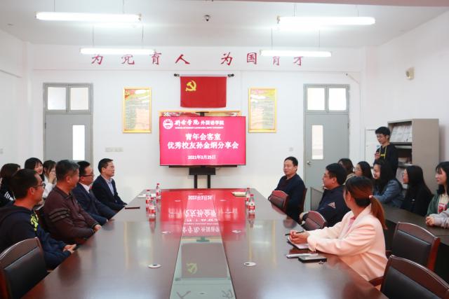 3月25日下午,外国语学院优秀校友孙金纲分享会在文C214党员活动室举行,学生就业与事务处处长刘柏松、外国语学院党委书记、院长刘华东和部分学生代表参会,外国语学院党委副书记胡小刚主持会议。