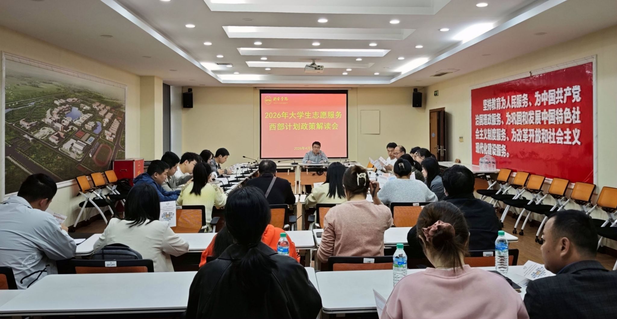 为扎实推进2026年大学生志愿服务西部计划宣传动员工作,帮助各二级学院就业干事、毕业班班主任精准把握政策要点、高效开展学生报名指导,近日,校项目办在行政楼一楼会议室召开2026年西部计划政策解读会。校项目办负责人、各二级学院就业干事、毕业班班主任代表及校项目办工作人员共30余人参会。会议指出,西部计划是服务乡村振兴、人才强国、区域协调发展等国家战略的重要举措,是共青团育人工程、就业促进工程和民族团结工程。2026年西部计划全国及地方项目招募规模扩大至6万人,...